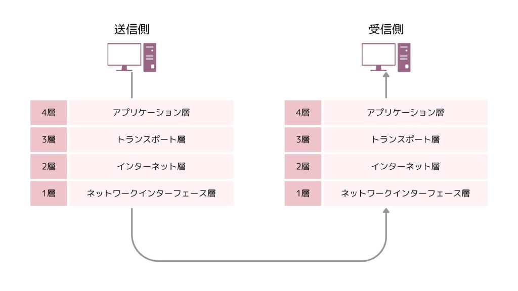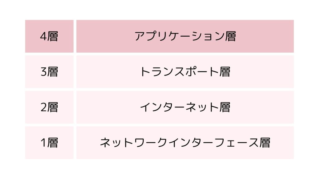 このような手順の処理を4つのレイヤーに分けたモデルがTCP/IPの階層モデルです。