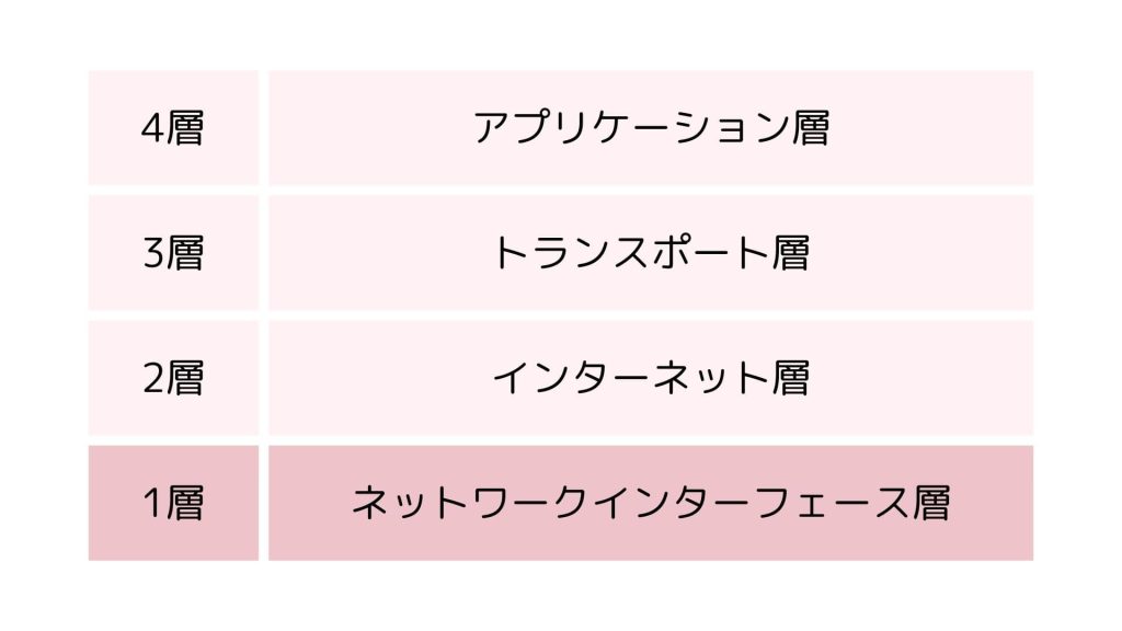 最下層に位置するネットワークインターフェース層はデータを物理的に送受信するための役割を担っています。リンク層とも呼ばれています。