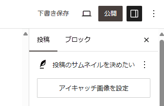 投稿編集ページの右上”設定”から「アイキャッチ画像を設定」を押下し画像をアップロードできます。その後、利用したい画像を選択することでサムネイルとして利用できます。