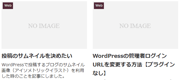 現状、サムネイルを設定していないため、下のような「NO IMAGE」と表示されている状況です。これではあまりに物足りない…